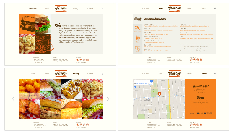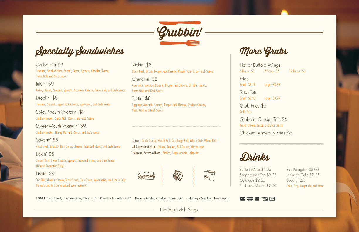 Grubbin’ is a local sandwich shop that serves delicious sandwiches infused with their signature garlic spread. The menu is inspired by grub-worthy food where the taste and quality stands for what they believe in. All sandwiches are made to order and handcrafted on freshly toasted. I recreated the branding, website, menu and posters, which is to match the overall style of this sandwich shop.